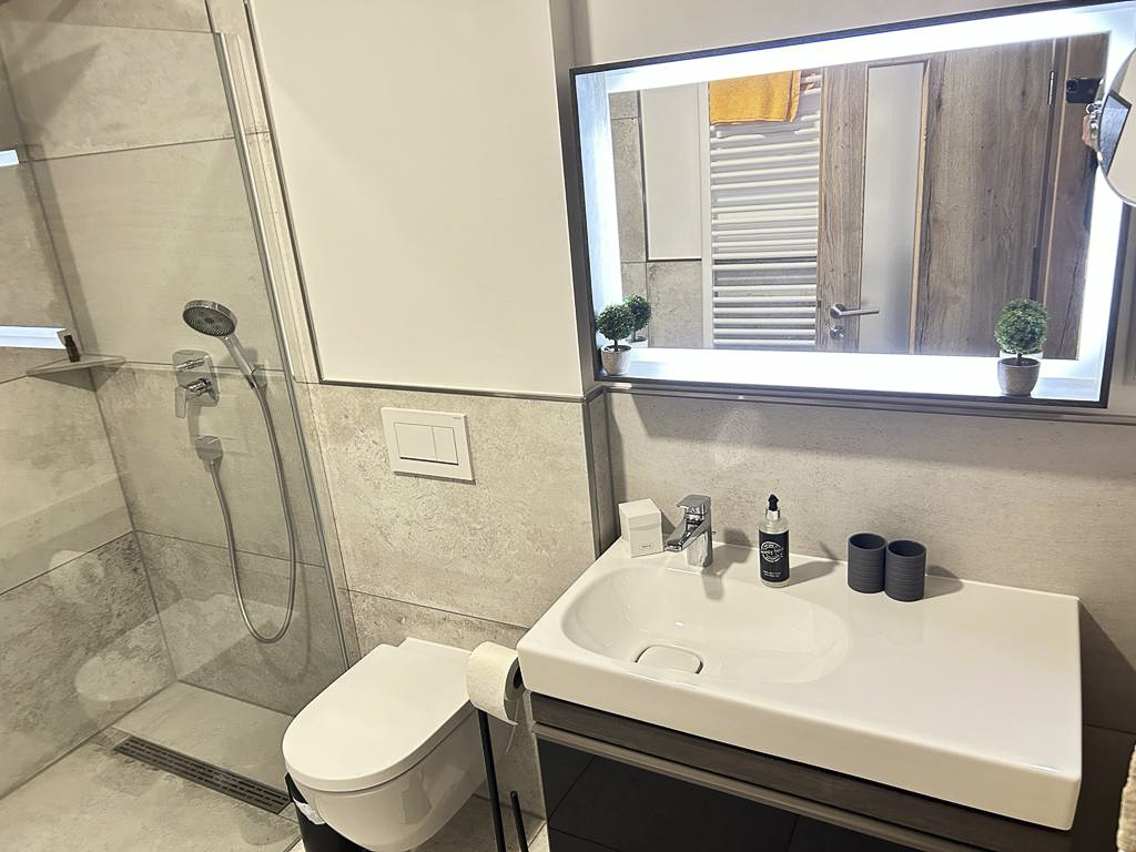 Das Bad ist ausgestattet mit einer bodengleichen Dusche (1,30x1,00 Meter) sowie hochwertiger Badkeramik.